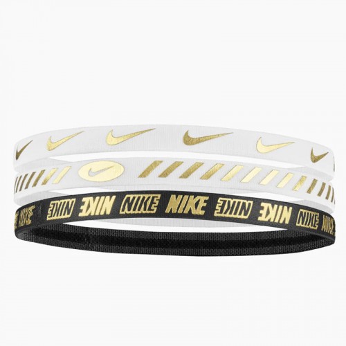 Пов'язки на голову Nike W HEADBANDS 3.0 3 PK METALLIC Налобники NIKE W HEADBANDS 3.0 призначені для занять активними видами спорту. Еластичність дозволяє легко знімати та надягати пов'язку. Вони не зміщуються під час вправи та не відволікають від занять спортом. Силіконові елементи на внутрішній стороні надають додаткову підтримку. Ширина пов'язок: 1,2 см.